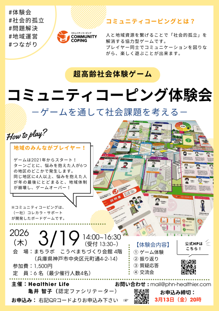 お知らせが遅くなりましたが、3月19日(木)に神戸市内で超高齢社会体験ゲーム 「コミュニティコーピング体験会」を開催します。